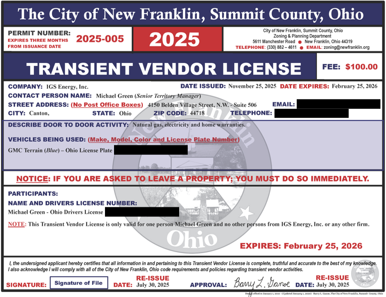 The City of New Franklin requires a city-issued license for transient vendor activities pursuant to City Ordinance 20-O-02. To apply for a Transient Vendor License, email the Zoning Department or call 330-882-3611.